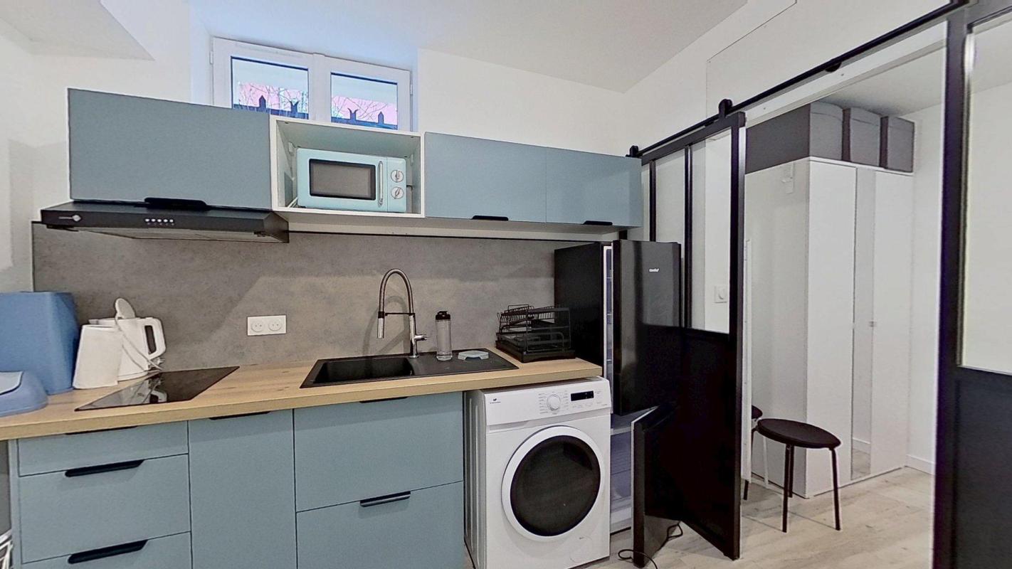 – Une cuisine équipée et moderne avec une machine à laver, un réfrigérateur et des plaques de cuisson.