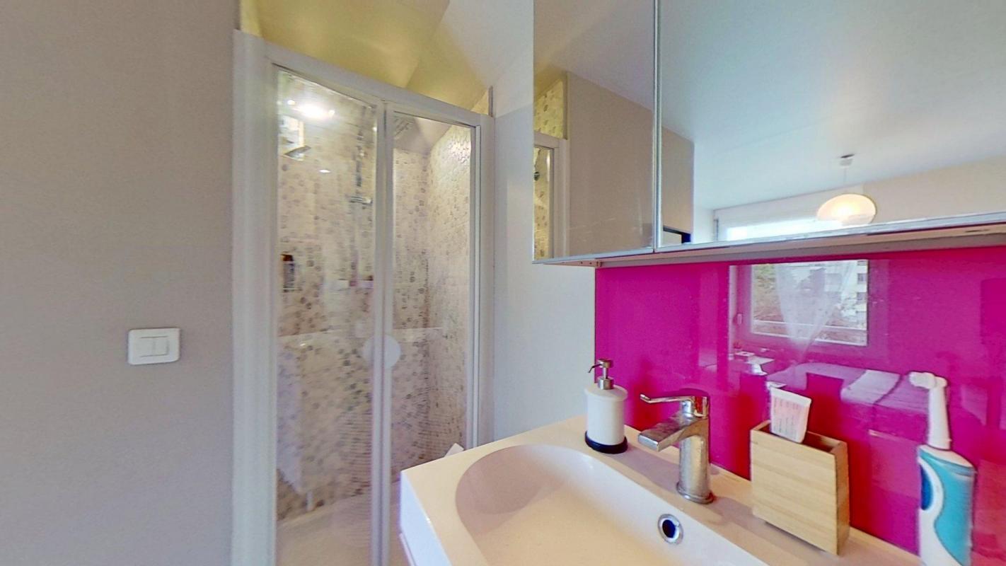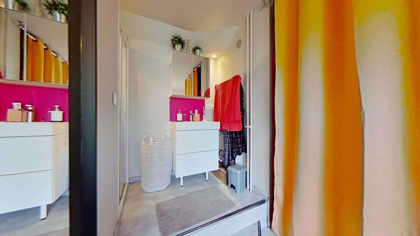 👉 Une salle d’eau ouverte sur la chambre équipée d’un sèche-serviette, d’une douche, d’un lavabo et de rangements.