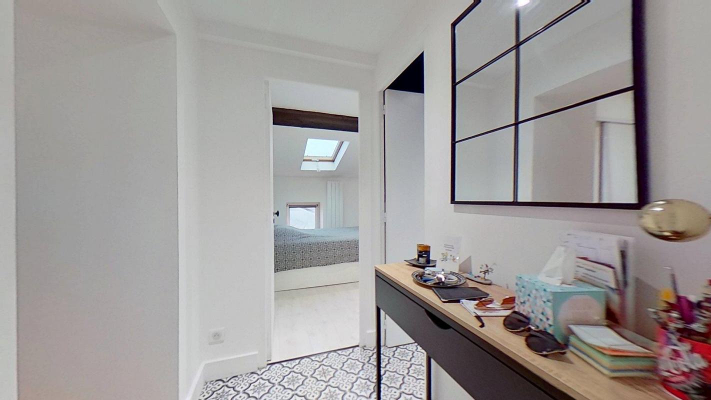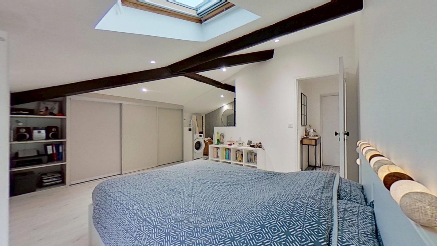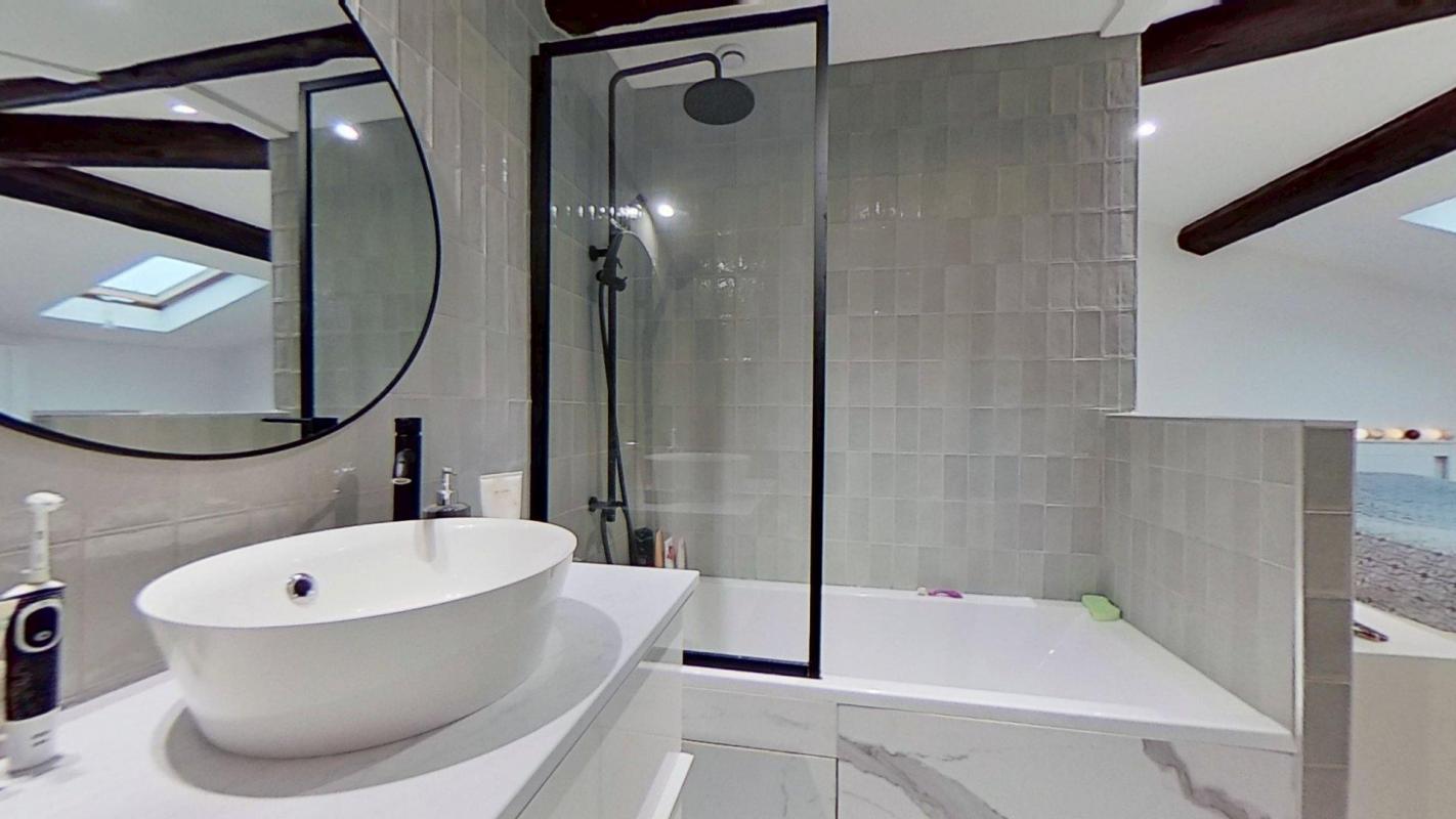 – L’appartement récent avec 60m2 au sol, très calme, avec des velux donc très lumineux donne accès à un toilette séparé puis une grande chambre avec placards intégrés, poutres apparentes et sa salle de bain ouverte avec baignoire.