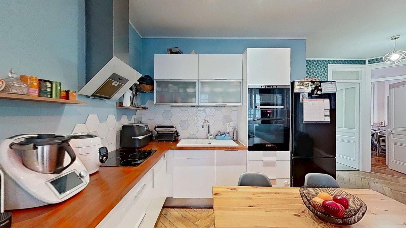 – Le séjour, spacieux et convivial, bénéficie d’un grand salon baigné de lumière avec parquet d’origine et cheminée ancienne. Il se compose de trois espaces bien définis :un coin détente avec canapé, un espace repas avec une table extensible idéale pour recevoir et un coin cuisine ouvert, parfaitement intégré à la pièce de vie.