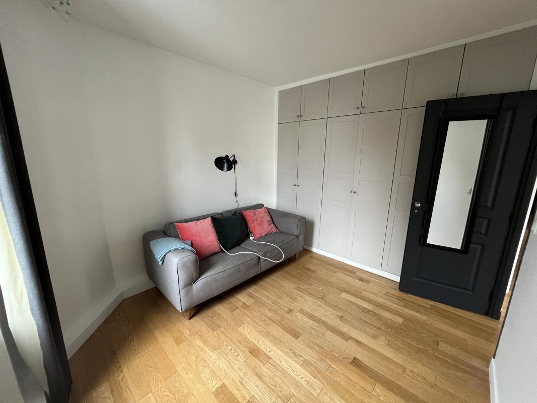 Une grande chambre séparée en 2 espaces, l’un aménagé avec un lit double, l’autre en espace détente avec canapé et grands placards,