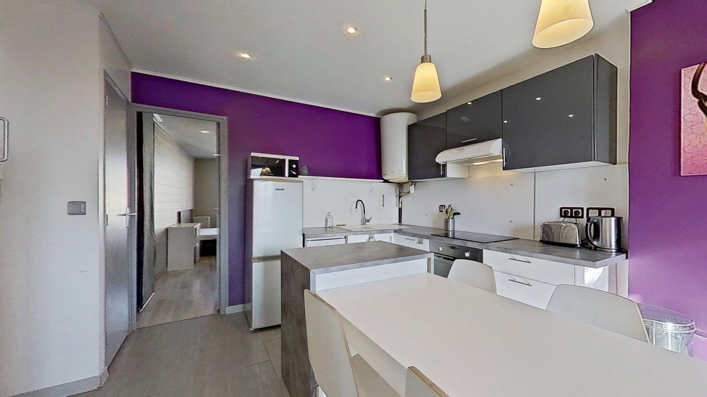 👉 Le séjour, lumineux et chaleureux, est équipé d’un canapé, d’une télévision et d’une cuisine ouverte entièrement équipée : four, micro-ondes, frigo-congélateur, lave-linge, lave-vaisselle, hotte, plaques de cuisson, évier et îlot central. Un espace idéal pour recevoir ou profiter d’un repas convivial.