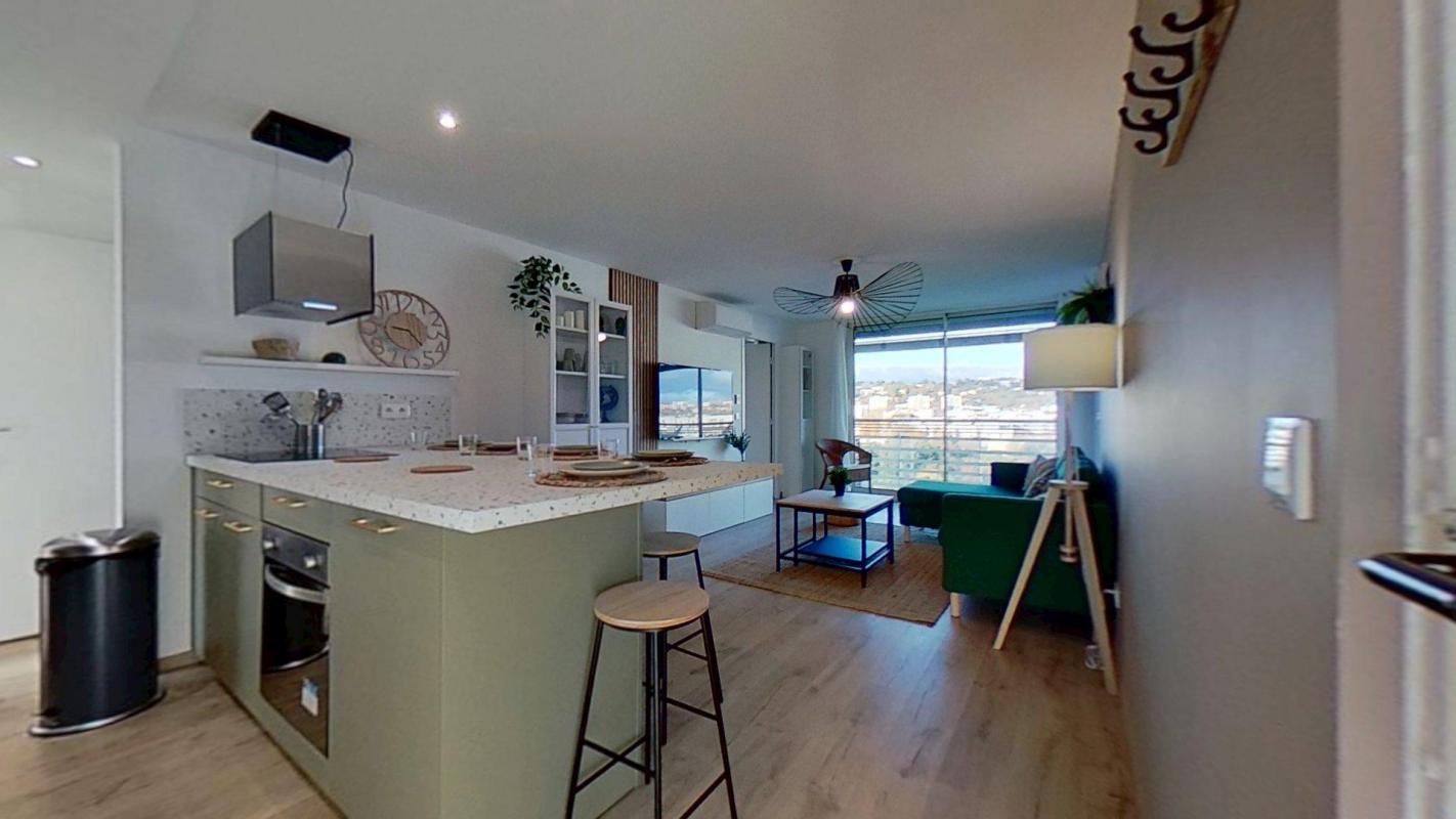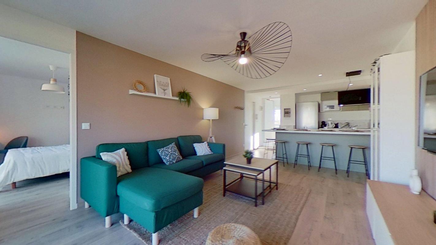👉 Le séjour est lui aussi rénové et entièrement équipé avec un canapé et l’accès direct au balcon filant.
