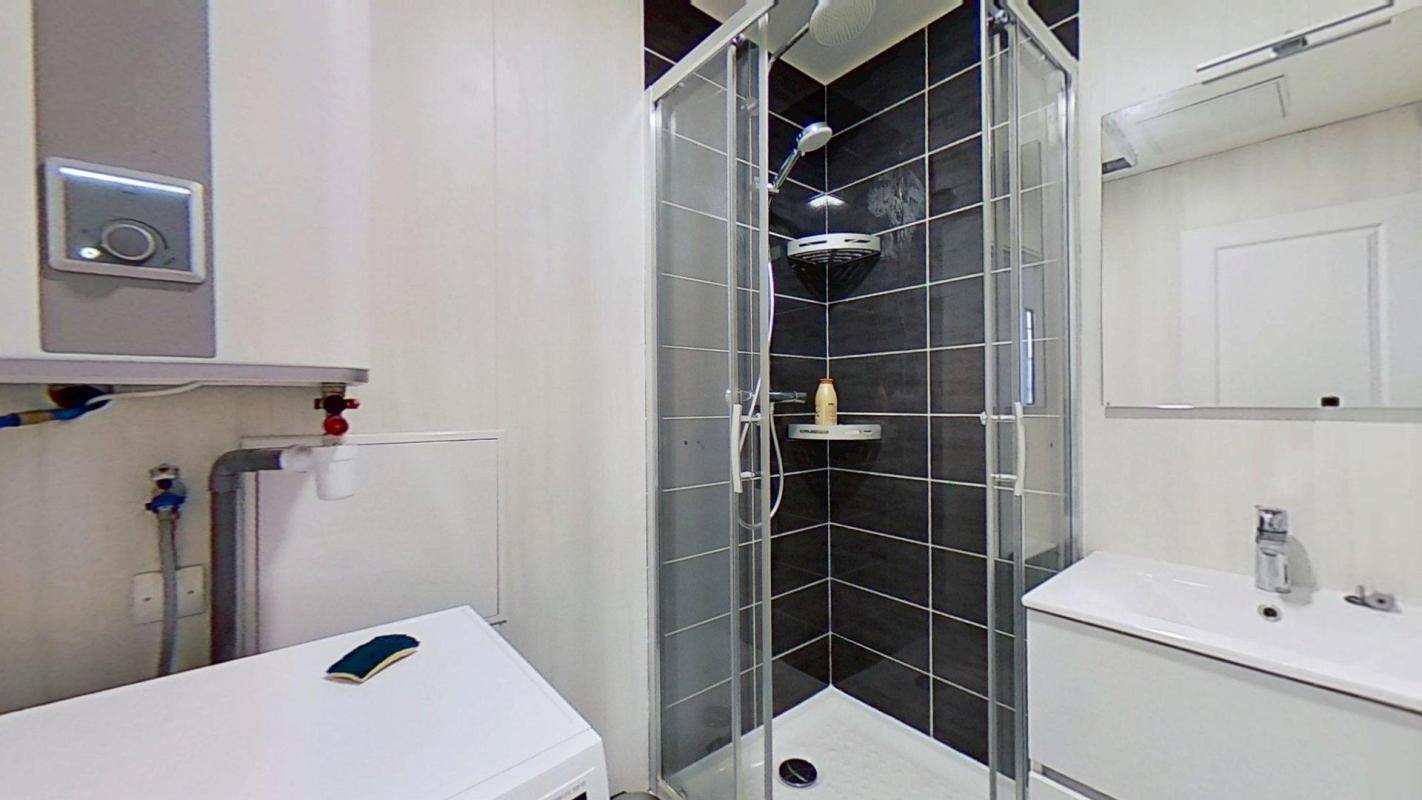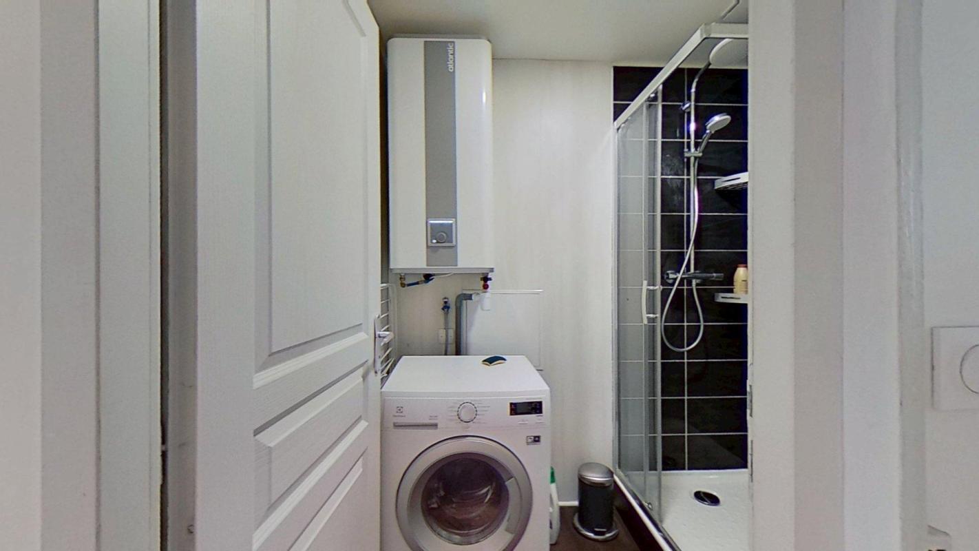 – Une salle d’eau avec machine à laver et rangement.
