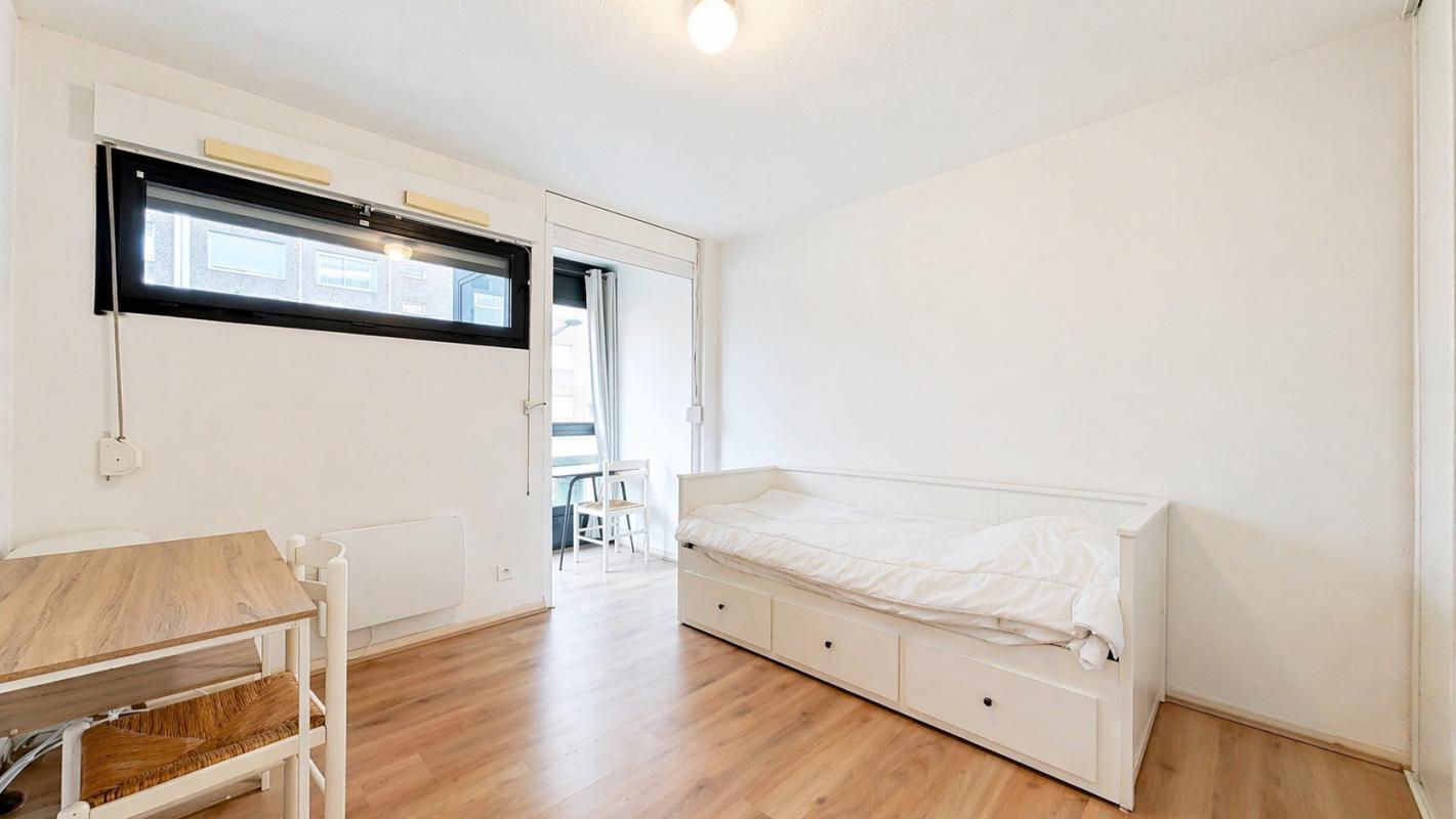 👉 Une pièce de vie avec un coin bureau, un dressing mural et un coin nuit avec un canapé-lit.