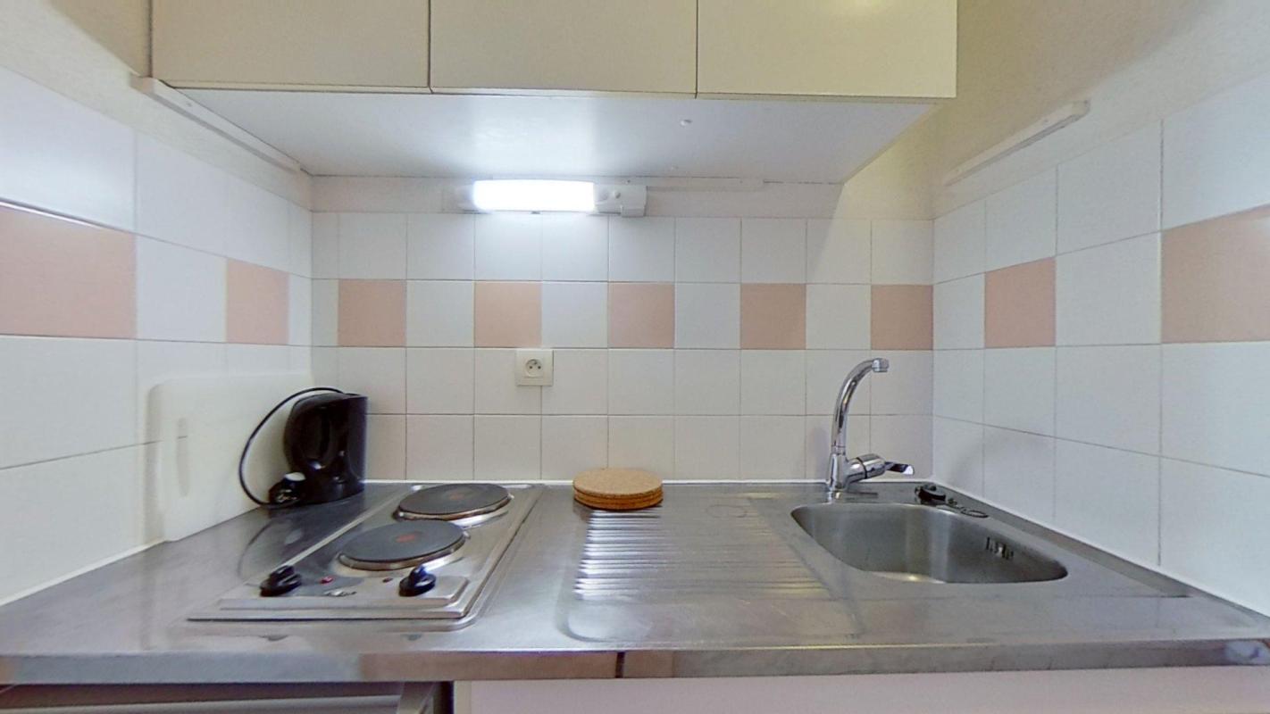 👉 Une cuisine fermée et équipée d’un frigidaire, de plaques de cuisson et de rangements.
