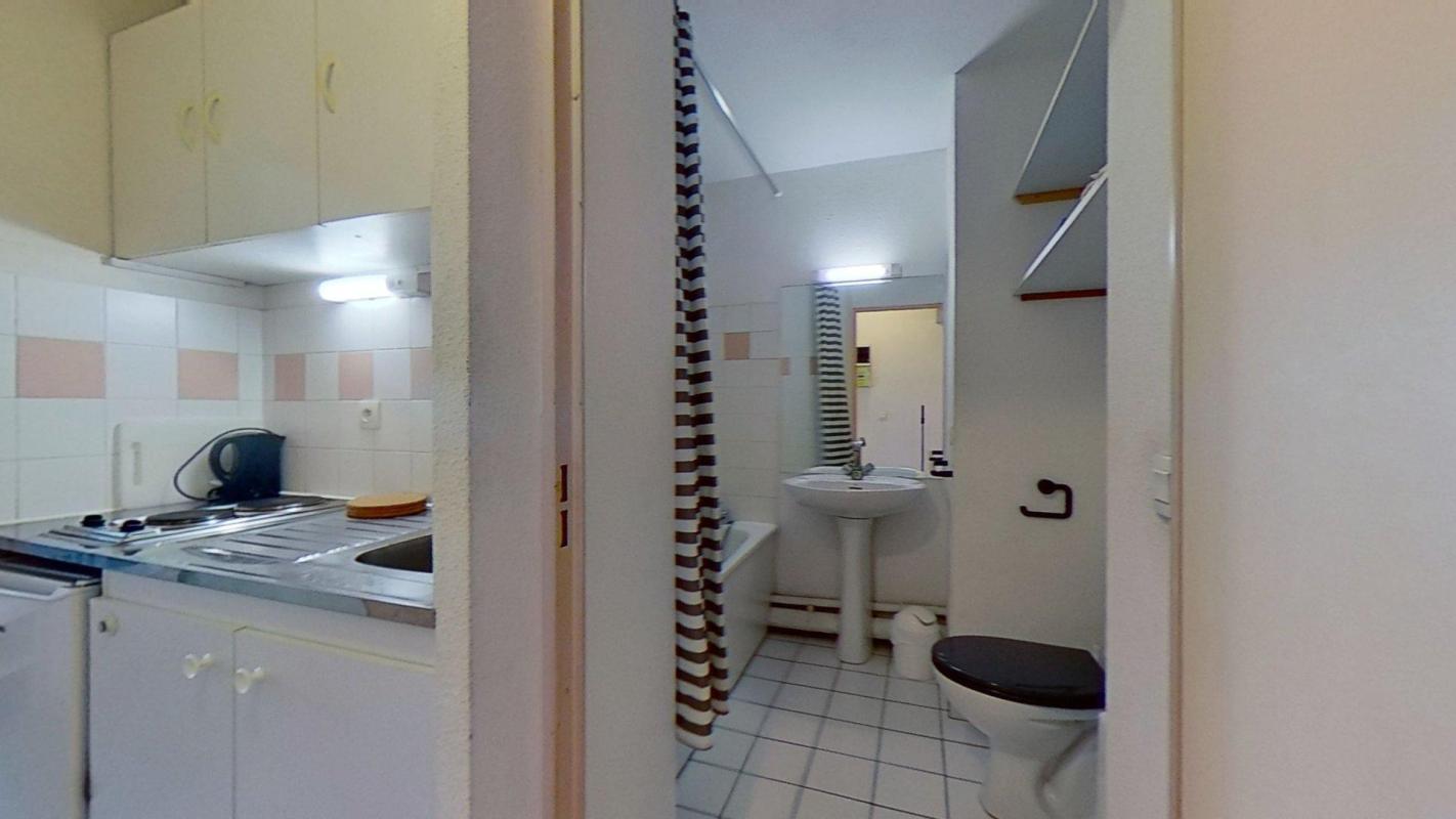 👉 Une entrée offrant l’accès à une salle de bain fermée avec toilettes, lavabo et étagère de rangement.