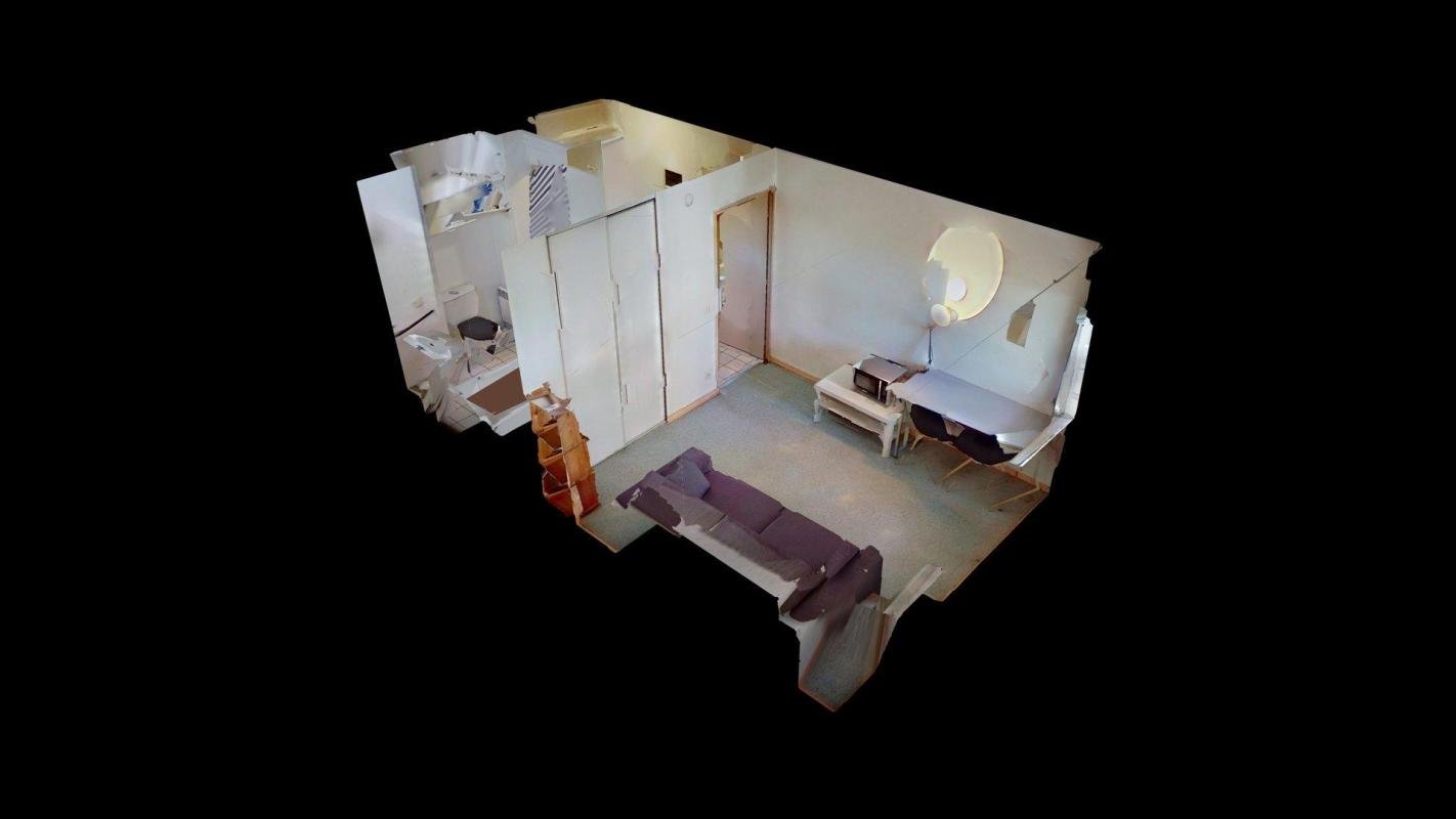👉 Une pièce de vie avec un coin bureau, un dressing mural et un coin nuit avec un canapé-lit.