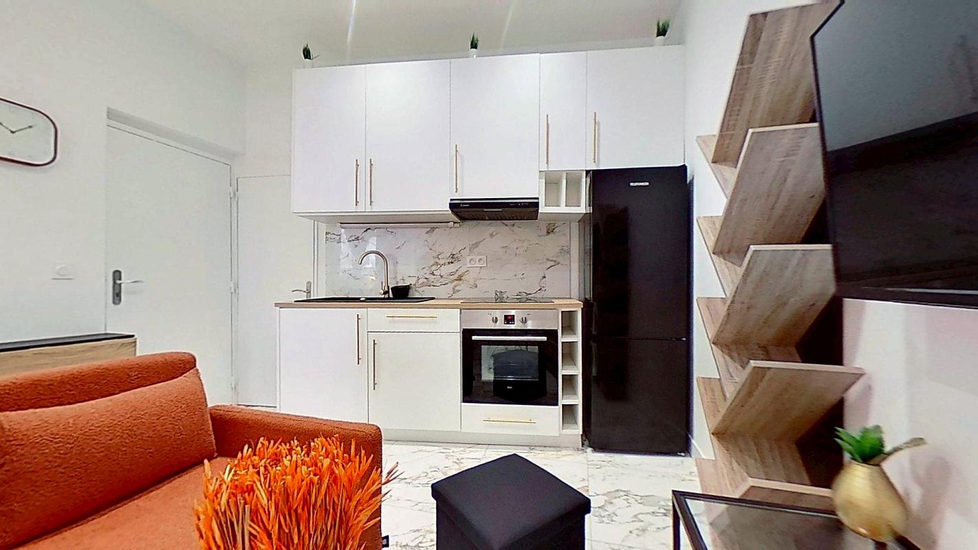 – Dès l’accès au logement, on découvre directement une pièce de vie particulièrement spacieuse, sublimée par ses beaux volumes et sa luminosité. Le séjour accueille un grand canapé, un espace télévision déjà installé, ainsi qu’un aménagement convivial permettant de profiter pleinement de cet espace chaleureux et moderne. L’ensemble bénéficie d’une rénovation récente avec des matériaux de qualité, dans un esprit contemporain soigné.