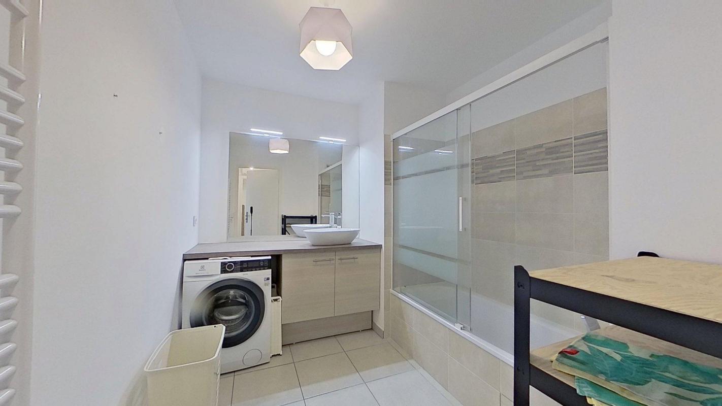 👉 Une salle de bain avec une douche, une machine à laver et un placard de rangement