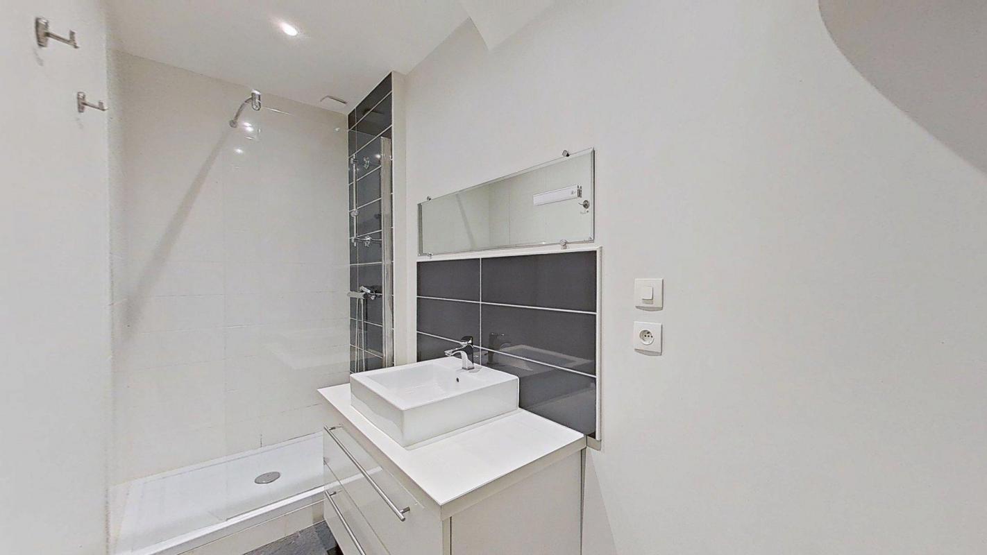 👉Une salle d’eau moderne avec douche à l’italienne, meuble vasque et arrivée pour machine à laver.