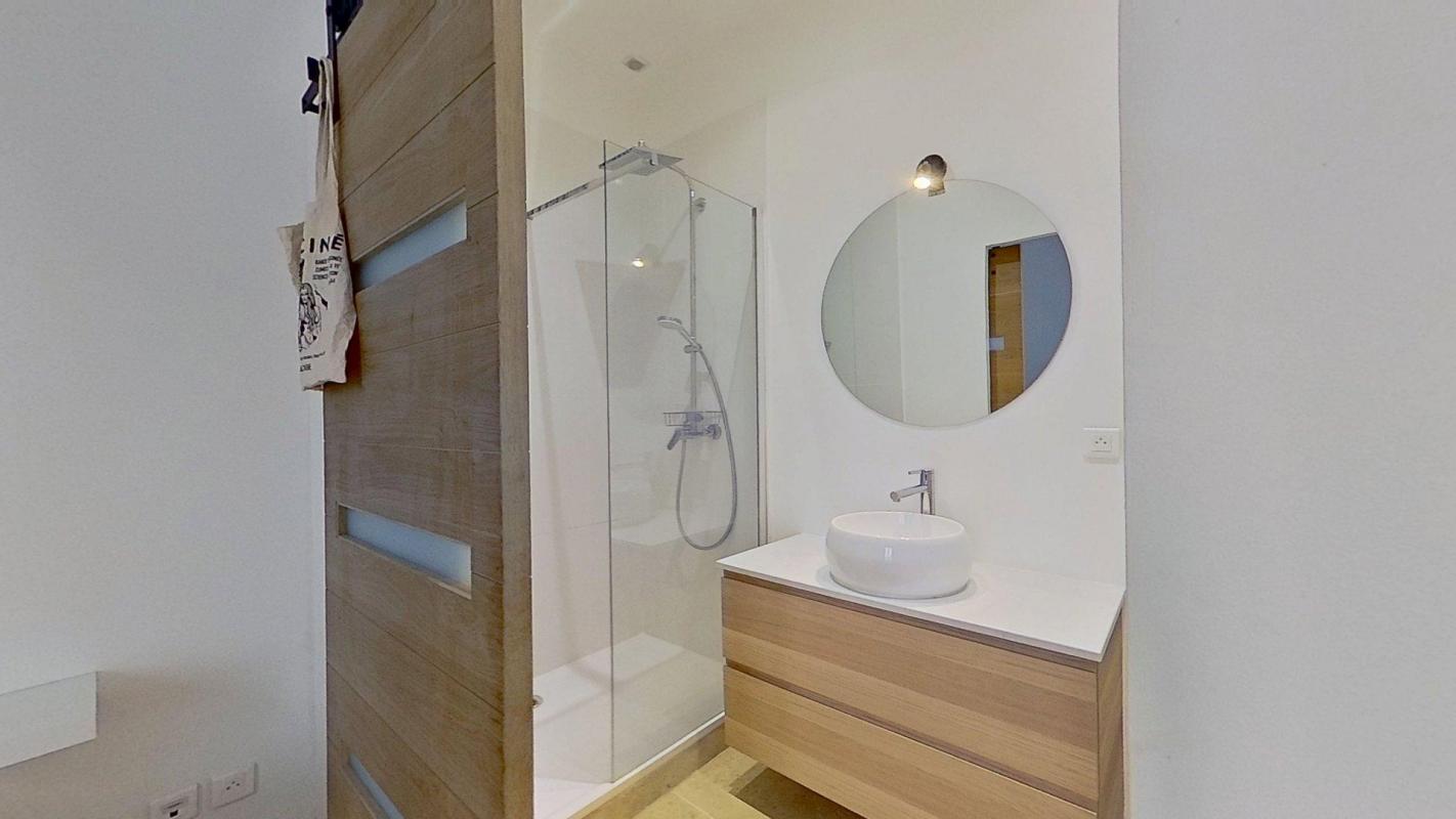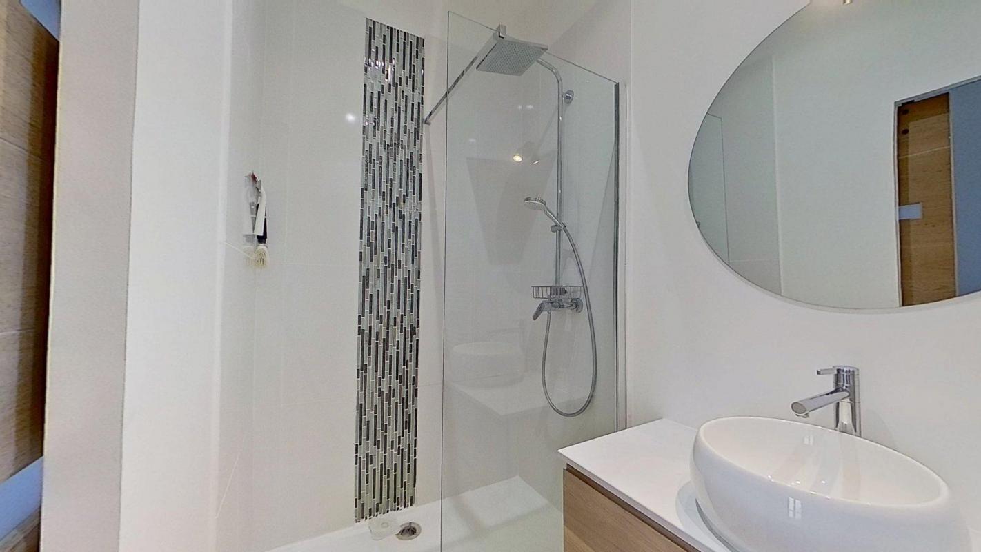 👉 Une belle chambre lumineuse avec un lit coffre et un placard de rangement ouverte sur une salle de bain rénové avec une spacieuse douche et équipé d’une machine à laver