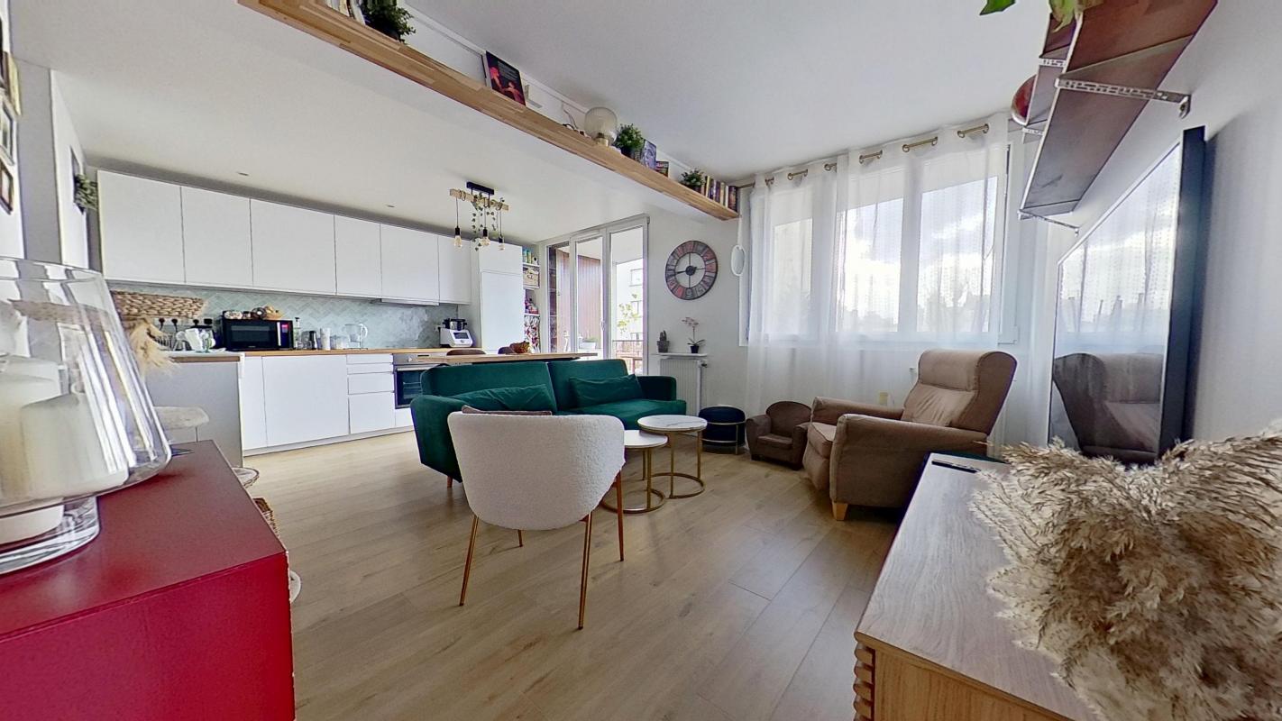 Une cuisine entièrement équipée (four, lave-vaisselle, réfrigérateur), ouverte sur une spacieuse pièce de vie, offrant un espace convivial et lumineux.
