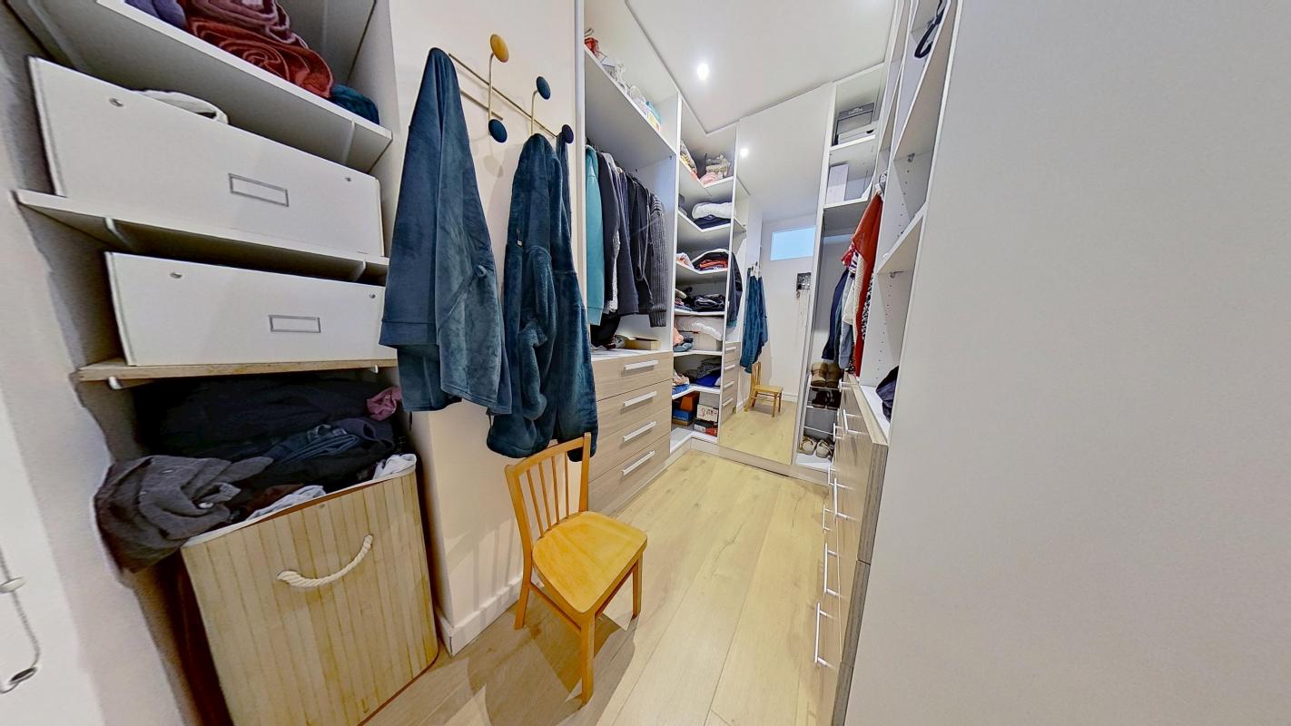 Une chambre principale confortable, équipée d’un lit double, accès à un dressing.