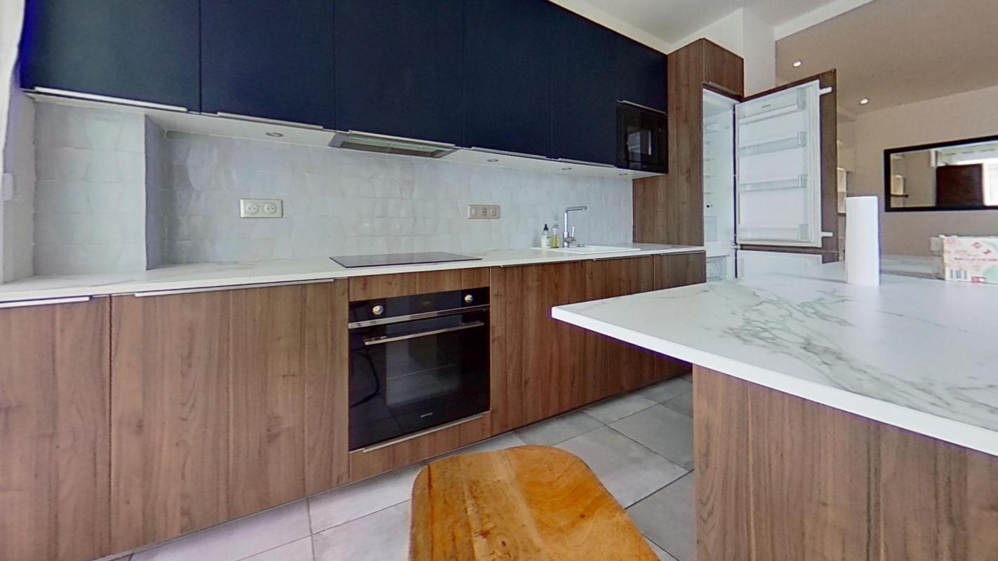 une cuisine ouverte moderne entièrement équipée (plaques à induction, four, réfrigérateur, lave-vaisselle, hotte, nombreux rangements et ilot central),