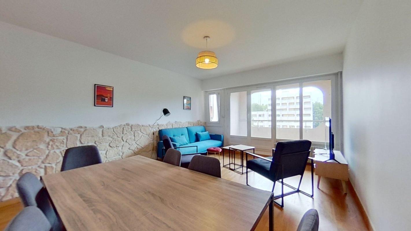 Une pièce de vie avec un coin salle à manger et un coin salon avec écran plat offrant un accès direct au balcon filant.