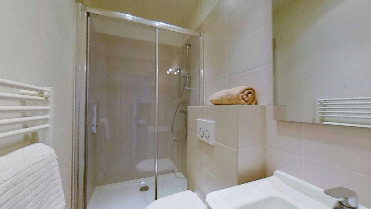 👉 Une salle de douches avec WC, lavabo, grande douche et miroir